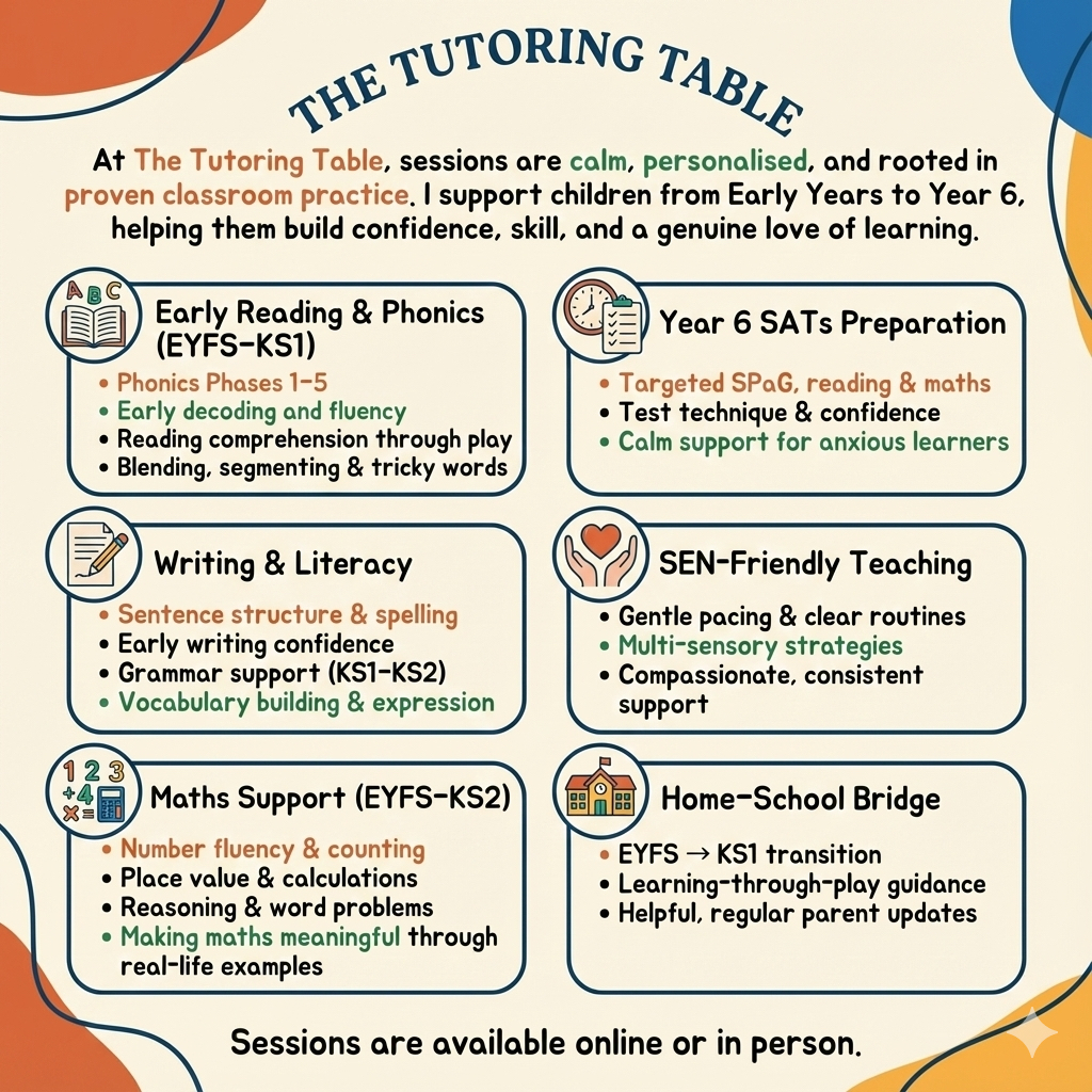 At The Tutoring Table, sessions are calm, personalised, and rooted in proven classroom practice. I support children from Early Years to Year 6, helping them build confidence, skill, and a genuine love of learning.